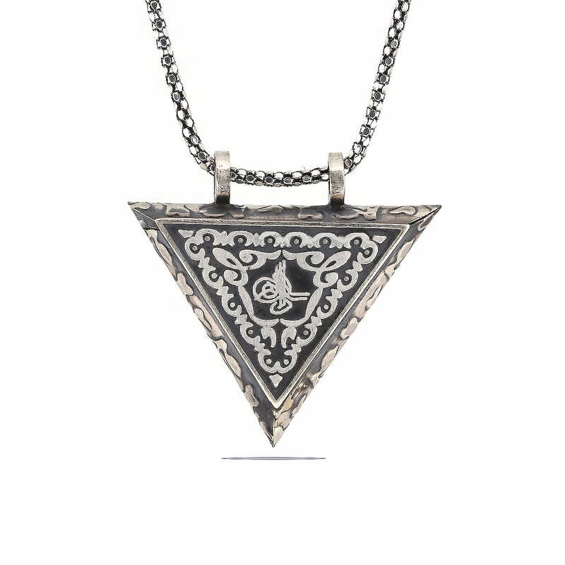 Silver Triangle Openable Tughra Amulet Necklace Tughra means the signature of the Ottoman sultans. Each tugra expresses the name, existence and reign of the sultan it belongs to. The tugra symbol has survived to the present day in many forms, different for each sultan. The tugra was preserved in every period of the Ottoman Empire and never lost its importance. And over time, it has an important place in our calligraphy, and is kept alive artistically by calligraphers today. The necklace created with this spirituality is made of 925 sterling silver. The necklace is oxidized. Like other silver necklaces, the silver tughra amulet necklace is produced entirely by hand. Due to silver and precious stones, there may be ± 10% deviation in the average product weight. Product Length: 4.00 cm. Product Width: 4.50 cm. Chain Length: 55.00 cm. Average Weight: 18.50 gr.