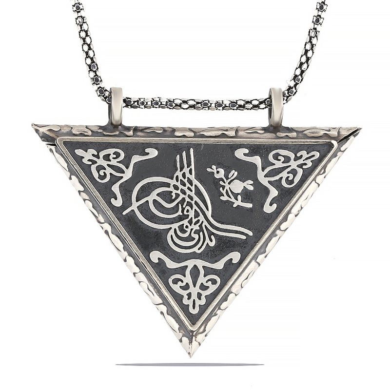 Silver Triangle Openable Tughra Amulet Necklace Tughra means the signature of the Ottoman sultans. Each tugra expresses the name, existence and reign of the sultan it belongs to. The tugra symbol has survived to the present day in many forms, different for each sultan. The tugra was preserved in every period of the Ottoman Empire and never lost its importance. And over time, it has an important place in our calligraphy, and is kept alive artistically by calligraphers today. The necklace created with this spirituality is made of 925 sterling silver. The necklace is oxidized. Like other silver necklaces, the silver tughra amulet necklace is produced entirely by hand. Due to silver and precious stones, there may be a ± 10% deviation in the average product weight. Product Length: 5.00 cm. Product Width: 6.00 cm. Chain Length: 55.00 cm. Average Weight: 32.35 gr.