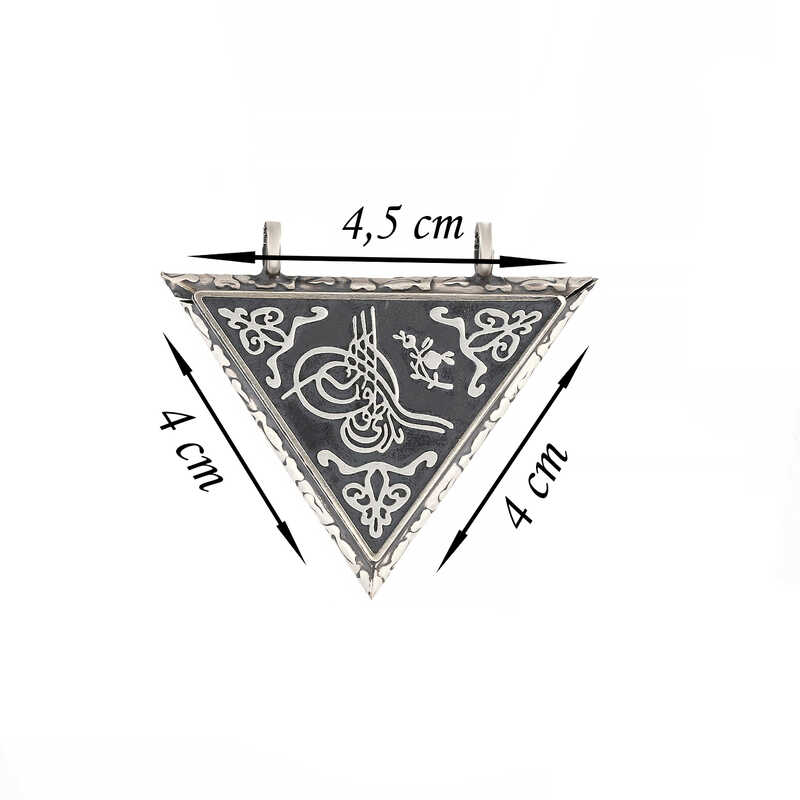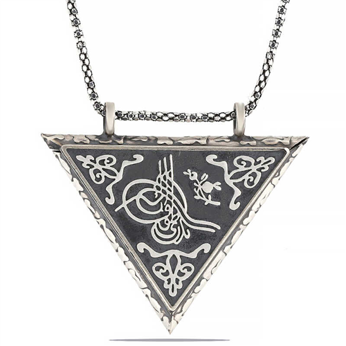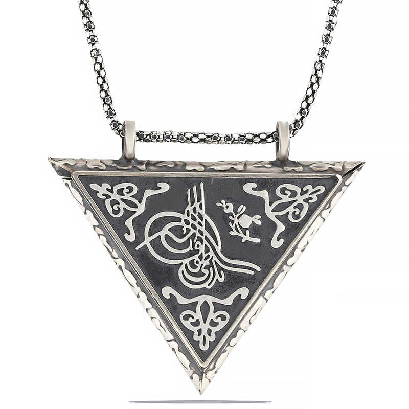 Silver Triangle Openable Tughra Amulet Necklace Tughra means the signature of the Ottoman sultans. Each tugra expresses the name, existence and reign of the sultan it belongs to. The tugra symbol has survived to the present day in many forms, different for each sultan. The tugra was preserved in every period of the Ottoman Empire and never lost its importance. And over time, it has an important place in our calligraphy, and is kept alive artistically by calligraphers today. The necklace created with this spirituality is made of 925 sterling silver. The necklace is oxidized. Like other silver necklaces, the silver tughra amulet necklace is produced entirely by hand. Due to silver and precious stones, there may be a ± 10% deviation in the average product weight. Product Length: 4.00 cm. Product Width: 4.50 cm. Chain Length: 55.00 cm. Average Weight: 20.25 gr.