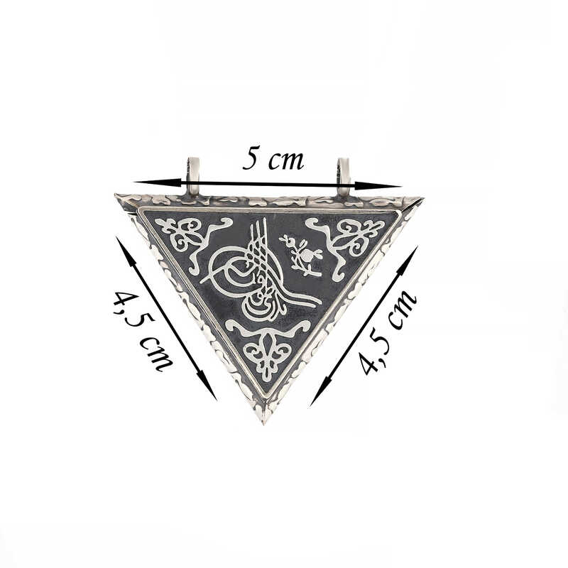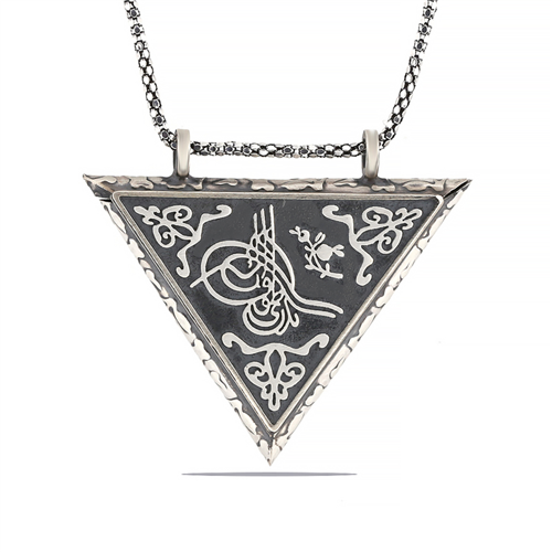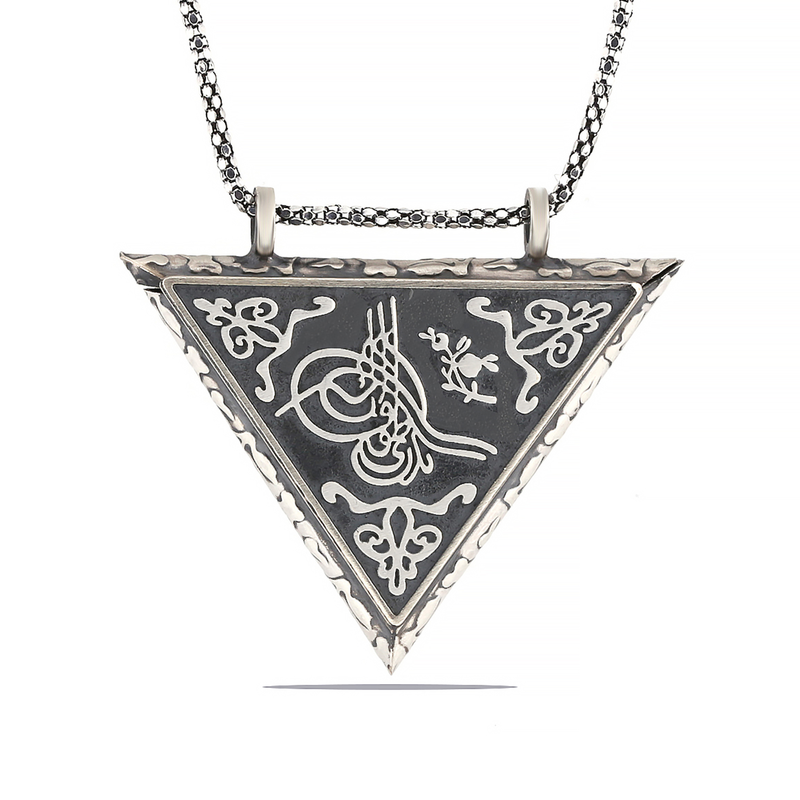 Silver Triangle Openable Tughra Amulet Necklace Tughra means the signature of the Ottoman sultans. Each tugra expresses the name, existence and reign of the sultan it belongs to. The tugra symbol has survived to the present day in many forms, different for each sultan. The tugra was preserved in every period of the Ottoman Empire and never lost its importance. And over time, it has an important place in our calligraphy, and is kept alive artistically by calligraphers today. The necklace created with this spirituality is made of 925 sterling silver. The necklace is oxidized. Like other silver necklaces, the silver tughra amulet necklace is produced entirely by hand. Due to silver and precious stones, there may be a ± 10% deviation in the average product weight. Product Length: 4.50 cm. Product Width: 5.00 cm. Chain Length: 55.00 cm. Average Weight: 24.35 gr.