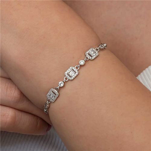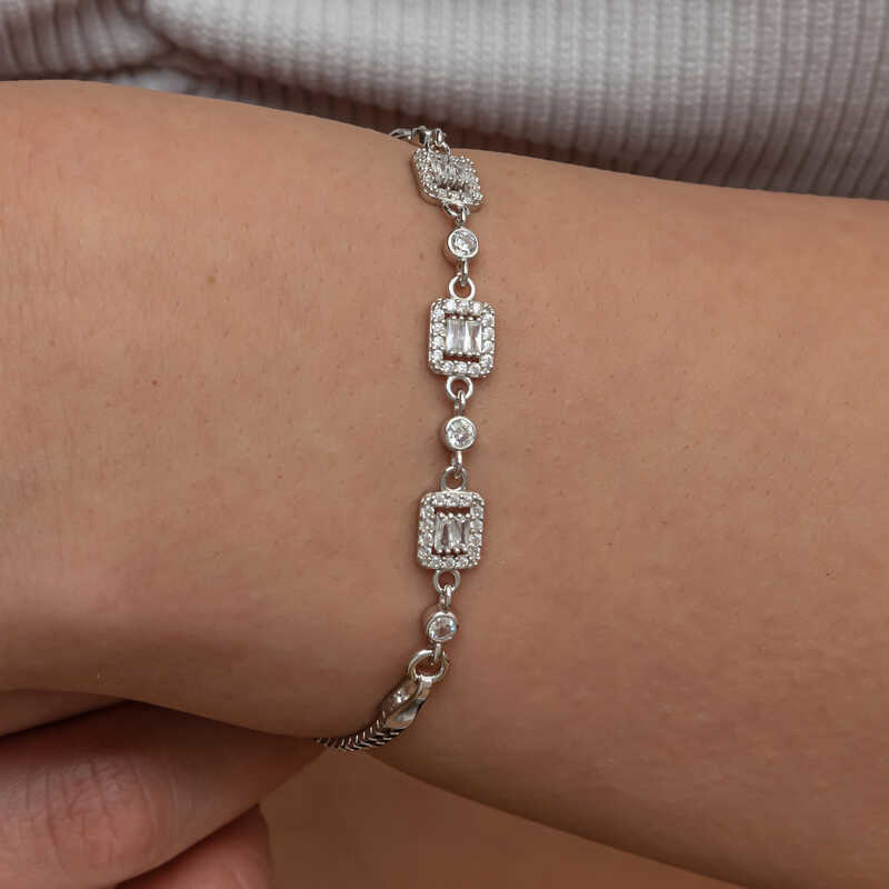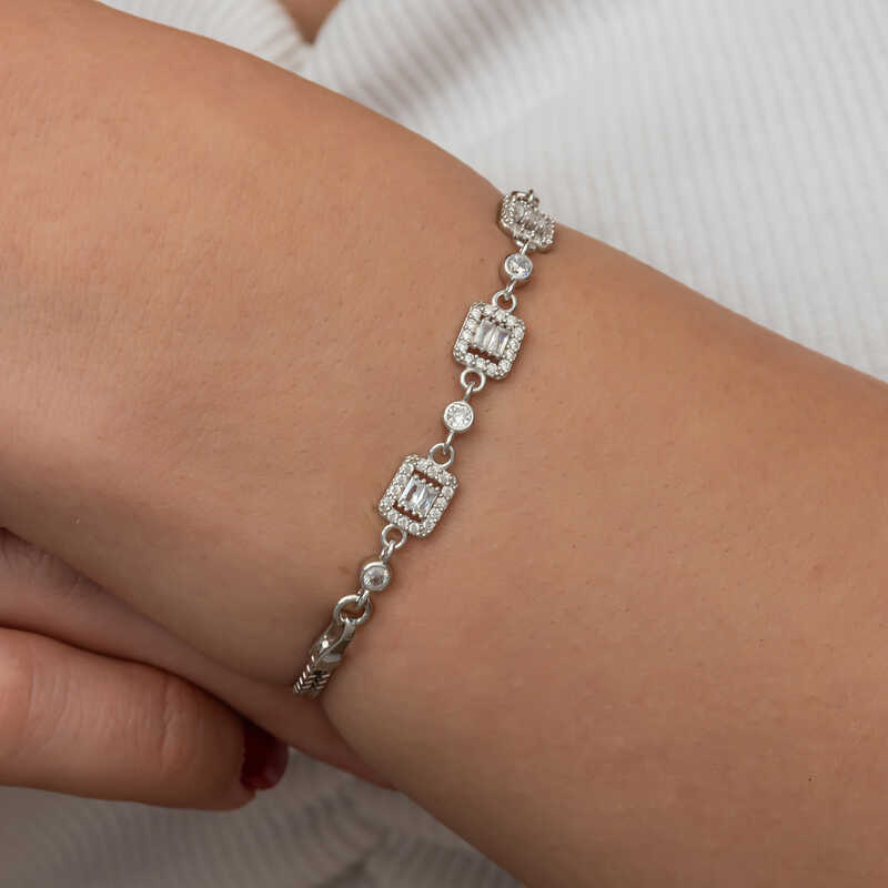 Silver Triple Baguette Stone Women's Bracelet Triple baguette stone women's bracelet is a type of accessory that combines elegance and style. This bracelet is an accessory that can be easily preferred for both daily use and special occasions. It can be combined with different styles and goes well with many outfits. Rhodium-plated silver. Rhodium-plated zircon stone square women's bracelet models preserve their shine for a long time. Due to silver and precious stones, there may be ± 10% deviation from the average product weight. Square Diameter: 0.80 cm Bracelet Length: 21 cm Average Weight: 5.10 gr.
