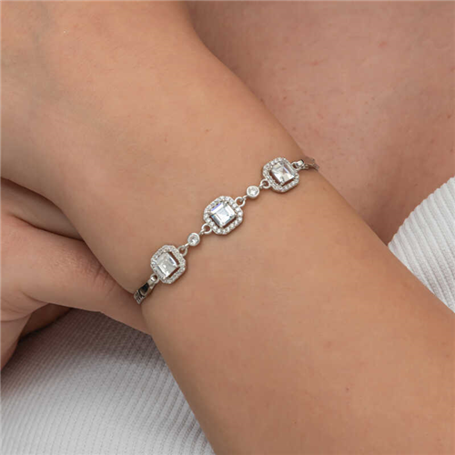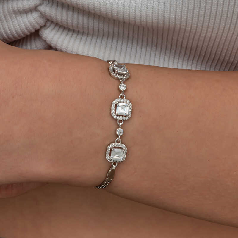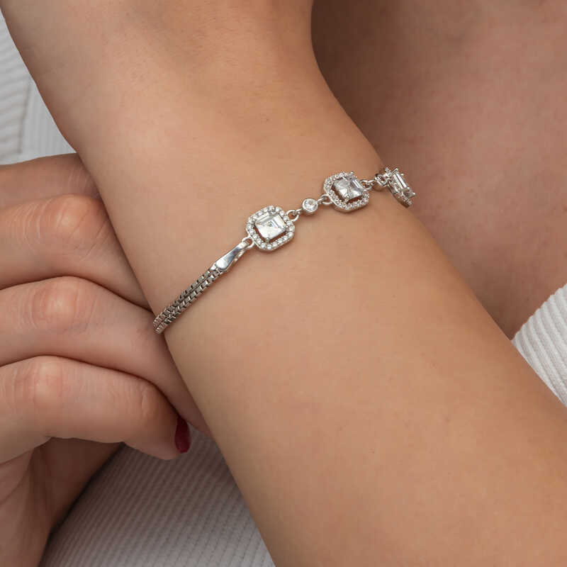 Silver Triple Square Women's Bracelet Triple square women's bracelet is a type of accessory that combines elegance and grace. These bracelets can be easily preferred in different environments from daily use to special occasions. They can be chosen both alone and in combination with other jewelry to create a stylish look. Rhodium-plated silver. Rhodium-plated zircon stone square women's bracelet models preserve their shine for a long time. Due to silver and precious stones, there may be ± 10% deviation from the average product weight. Square Diameter: 1.00 cm Bracelet Length: 20 cm Average Weight: 5.60 gr.