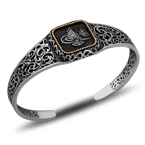 Silver Tughra Adjustable Cuff Men's Bracelet The Tughra adjustable cuff men's bracelet is an accessory that often represents the Ottoman Empire and Ottoman culture. The Tughra was used as the signature and symbol of the Ottoman sultans. Since the Tughra symbolizes the power and authority of the sultan, the person wearing this bracelet can feel powerful and charismatic. The silver bracelet is an excellent option as a birthday gift, Valentine's Day gift or a gift on other special occasions. The silver is oxidized. Silver bracelets with oxidized coating preserve their shine for a long time. Due to silver and precious stones, there may be a ± 10% deviation from the average product weight. Bracelet Width: 2 cm Bracelet Diameter: 7 cm Average Weight: 36.00 gr.