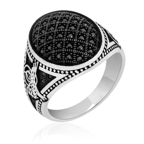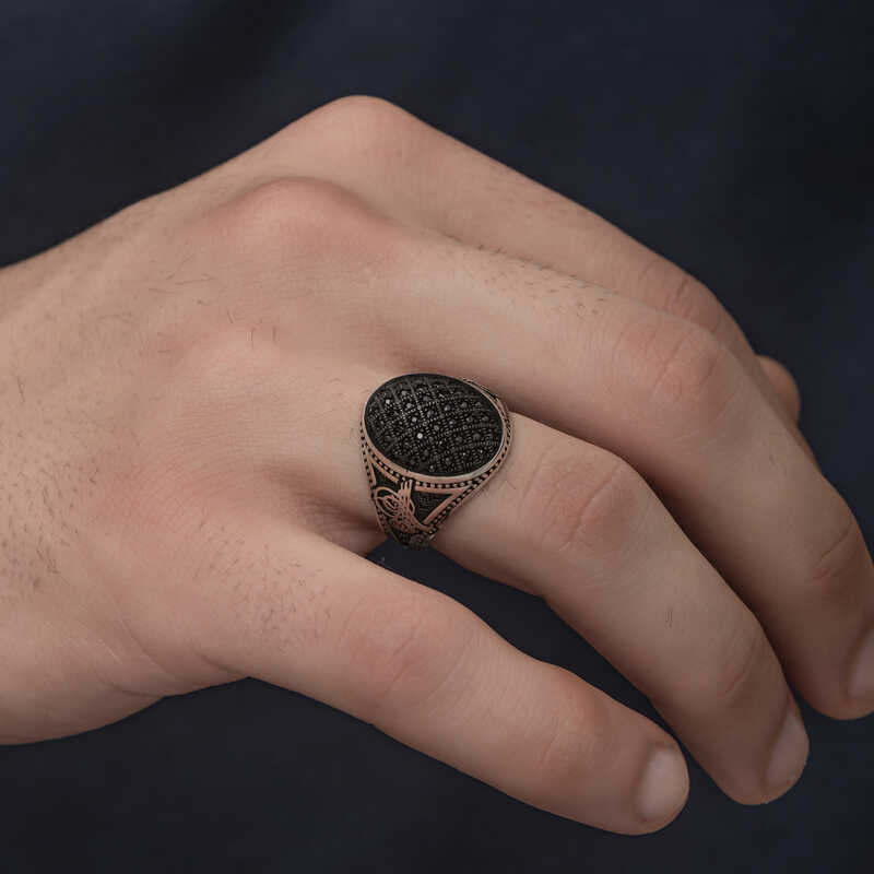 Silver Tughra Zircon Black Stone Men's RingThis men's ring model, made of zircon Black Stone stones on silver, is a stylish accessory that you can use at any time of the day. You can gift this ring to yourself or your loved ones on your birthday, Father's Day or special occasions. Black stone ring men's ring model is made of 925 sterling silver. Oxidized silver is coated. Oxidized silver men's ring models preserve their shine for a long time. As with all men's rings, the silver zircon Black stone men's ring model is also handmade. Due to silver and precious stones, there may be ± 10% deviation in the average product weight.Width: 2.20 cmLength: 2.40 cmAvg. Weight: 8.8 gr.