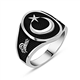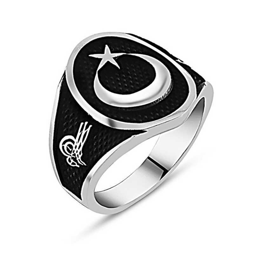 Silver Tughra Crescent Star Men's RingThe crescent and star or crescent-star is an ancient symbol consisting of a crescent and a star shape at the open end of the crescent. Flags using this symbol are mostly seen around the Mediterranean region, in the Middle East, and in Central Asia. Today, it is known as a symbol mostly used in the flags of Islamic countries. The crescent and star symbol appears on many flags, including the Turkish flag. The silver crescent and star men's ring model is a very stylish accessory that you can enjoy and gift to your loved ones. The crescent and star men's ring model with a signature is made of 925 sterling silver. It has an oxidized coating. The oxidized silver crescent and star men's ring models have an aged appearance. As with the silver crescent and star men's ring, all silver men's rings are produced entirely by hand. Due to silver and precious stones, there may be a ± 10% deviation from the average product weight.Average Weight: 8.00 gr.