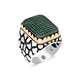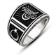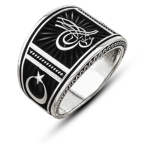 Silver Tughra Crescent Star Men's RingThe crescent and star or crescent-star is an ancient symbol consisting of a crescent and a star shape at the open end of the crescent. Flags using this symbol are mostly seen around the Mediterranean region, in the Middle East and Central Asia. Today, it is known as a symbol mostly used in the flags of Islamic countries. The crescent and star symbol appears on many flags, including the Turkish flag. The silver crescent and star men's ring model is a very stylish accessory that you can enjoy and gift to your loved ones. The crescent and star men's ring model with tughra is made of 925 sterling silver. It has an oxidized coating. The oxidized silver crescent and star men's ring models have an aged appearance. As with the silver crescent and star men's ring, all silver men's ring models are produced entirely by hand. Due to silver and precious stones, there may be a ± 10% deviation from the average product weight.Ring Width: 2.50 cmRing Length: 2.60 cmAvg. Weight: 9.80 gr.