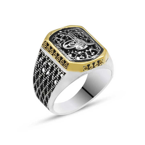 Men's Ring with Silver TughraTuğra is a symbol or signature that includes the name and epithet of the sultan. Tughra is a branch of calligraphy that has been written by master calligraphers for centuries. In Turkish, as a word, it means a special sign containing the name of the sultan, such as the sultan's signature. The original word is 'tughra' in the Oghuz dialect, which means the printed signature of the sultan. The first tughra used by Orhan Gazi consists of the expression 'Orhan bin Osman' and the first of the tughras is dated 1324 and 1348. A tughra belonging to Sultan Osman Gazi I has not been found anywhere to date. Therefore, there are 36 Ottoman sultans, but only 35 Ottoman sultan tughras. The section where the sultan's name and his father's name are written is called the throne, rostrum, or sere. The section extending from here to the left, from bottom to top, and consisting of two concentric curves, is called the beyze or banner. You can enjoy wearing this ring with the tughra emblem, which symbolizes the Ottoman Empire, and gift it to your loved ones. It is made of 925 sterling silver. The silver is rhodium-plated. Rhodium-plated products retain their shine for a long time and delay oxidation. All of our silver tughra emblem rings and other products are handcrafted. Due to the silver and precious stones, there may be a ±10% deviation in product weight.Average Weight: 13.50 gr.