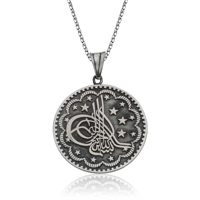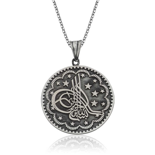 Silver Tughra Necklace Tughra means the signature of the Ottoman sultans. Each tugra expresses the name, existence, and reign of the sultan it belongs to. The tugra symbol has survived to the present day in many forms, different for each sultan. The tugra was preserved in every period of the Ottoman Empire and never lost its importance. And over time, it has also held an important place in our calligraphy, and is kept alive artistically by calligraphers today. You can enjoy wearing this stylish silver necklace with a tugra, which reflects this art, and choose it as a gift for birthdays, Valentine's Day or special occasions. The tugra necklace model is made of 925 sterling silver. The silver is oxidized. The average chain length is 55 cm. Like all silver necklace models, this silver tughra necklace model is also produced entirely by hand. Due to silver, there may be a ± 10% deviation in the average product weight. Width: 3.00 cm. Length: 3.00 cm. Average Weight: 13.50 gr