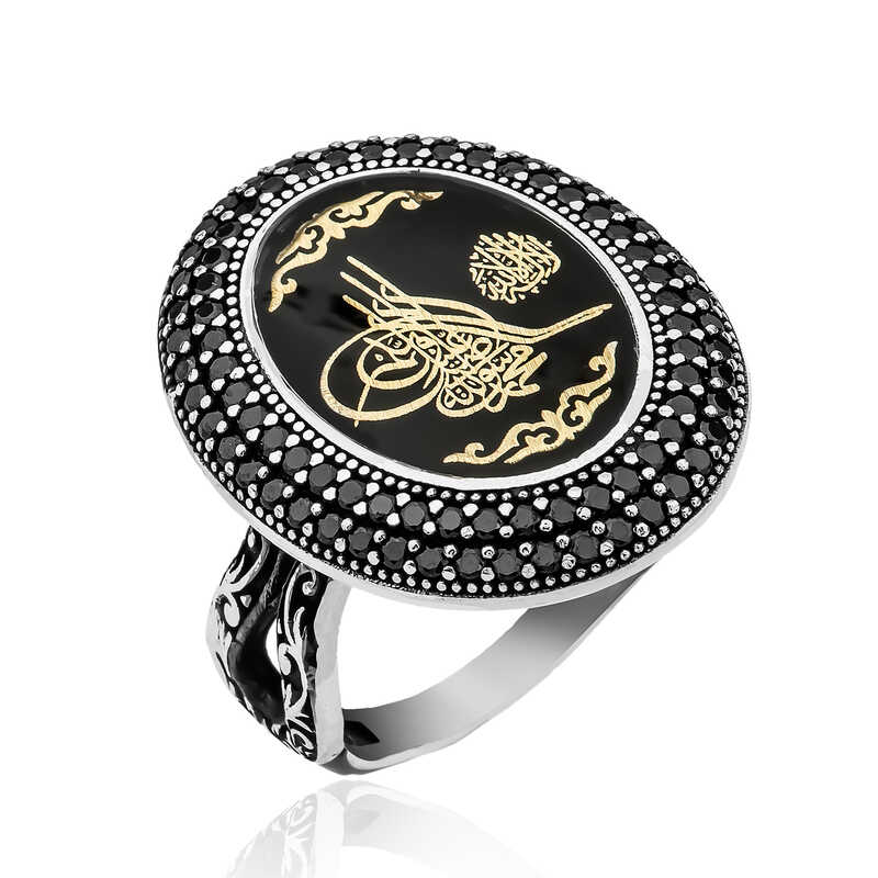 Silver Tughra Women's RingTughra means the signature of the Ottoman sultans. Each tugra expresses the name, existence, and reign of the sultan it belongs to. The tugra symbol has survived to the present day in many forms, different for each sultan. The tugra was preserved in every period of the Ottoman Empire and never lost its importance. And over time, it has an important place in our calligraphy, and is kept alive artistically by calligraphers today. You can enjoy wearing this silver ring that reflects this art and gift it to your loved ones on Father's Day or special occasions. The silver tughra women's ring is made of 925 sterling silver. The tughra ring is oxidized on the silver. Like all silver women's rings, the silver tughra women's ring is entirely handmade. The stones on it are zircon. Due to silver and precious stones, there may be a ± 10% deviation in the average product weight.Ring Width: 2.00 cmRing Length: 2.30 cmAverage Weight: 9.50 gr