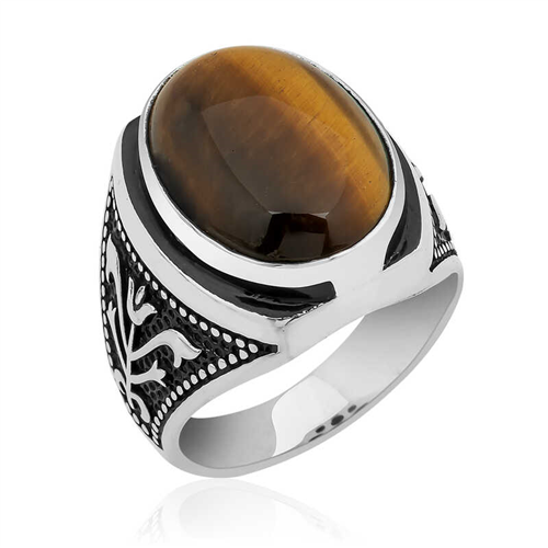 Tiger's Eye Ring with Silver Tulip InlayTiger's eye is a precious stone belonging to the Chalcedony group, which is a subspecies of Crystal Quartz. It takes its name from its distinctive color tones resembling those of a tiger's eyes. It has linear tones described as golden or honey-colored. Its iridescent and silky appearance is one of the features that make tiger's eye unique. Also described as the “stone of lovers,” tiger's eye is a stone that appeals to emotions. Among precious stones, it is one of the most prominent with its “protective” properties. It is also known to change color according to the wearer's movements or mood. You can choose this stylish ring for yourself or your loved ones on their birthdays, Father's Day or on special occasions. This stylish ring is made of 925 sterling silver. The silver is oxidized. Rings with oxidized coating achieve an authentic look. As with all men's rings, the silver tulip-inlaid tiger's eye stone men's ring is also handmade. Due to silver and precious stones, there may be a ± 10% deviation from the average product weight.Width: 1.50 cm.Length: 2.00 cm.Average Weight: 15.00 gr.