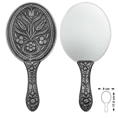 Silver Tulip Motif Hand Mirror Our products are the most beautiful silver accessories that you can gift to you and your loved ones. With their unique eye-catching designs, they are suitable for carrying in your bag. The product will be sent in a gift package... All of our products are handmade. and due to precious stones, there may be ± 5% deviation in product weight. Mirror Width: 8 cm Mirror Length: 17.50 cm Average Weight: 102 gr