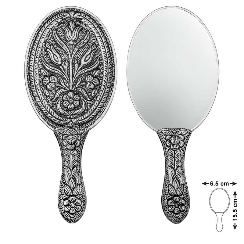 Silver Tulip Motif Hand Mirror Our products are the most beautiful silver accessories that you can gift to you and your loved ones. With their unique eye-catching designs, they are suitable for carrying in your bag. The product will be sent in a gift package... All of our products are handmade. and due to precious stones, there may be ± 5% deviation in product weight. Mirror Width: 6.50 cm Mirror Length: 15.50 cm Average Weight: 67 gr