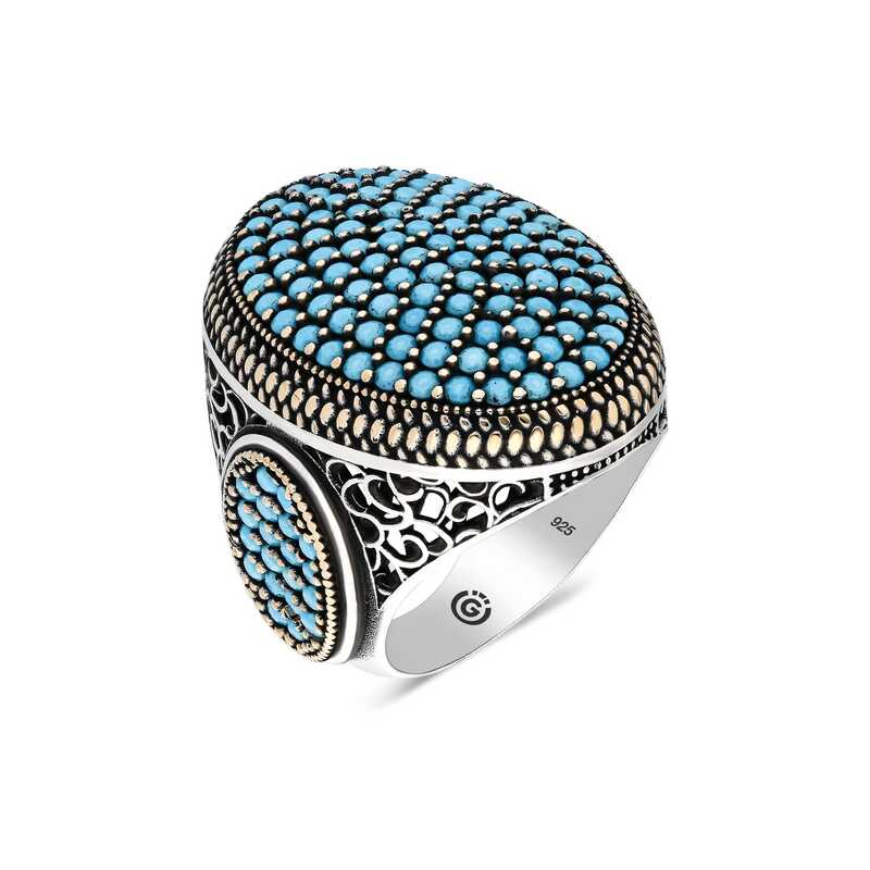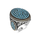Silver Turquoise Zircon Stone Oval Men's Ring This men's ring model, made of zircon and turquoise stones on silver, is a stylish accessory that you can use at any time of the day. You can gift this ring to yourself or your loved ones on your birthday, Father's Day or special occasions. The turquoise stone men's ring model is made of 925 sterling silver. Oxide coating is applied on the silver. Oxide coated silver men's ring models preserve their shine for a long time. As with all men's rings, the silver zircon and turquoise stone men's ring model is also handmade. Due to silver and precious stones, there may be ± 10% deviation in the average product weight.Width: 2.30 cmLength: 3.20 cmAvg. Weight: 25 gr.