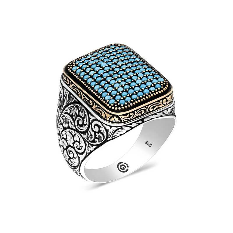 Silver Turquoise Zircon Stone Square Men's Ring This men's ring model, made of zircon and turquoise stones on silver, is a stylish accessory that you can use at any time of the day. You can gift this ring to yourself or your loved ones on your birthday, Father's Day or special occasions. The turquoise stone men's ring model is made of 925 sterling silver. Oxide coating is applied on the silver. Oxide coated silver men's ring models preserve their shine for a long time. As with all men's rings, the silver zircon and turquoise stone men's ring model is produced by hand. Due to silver and precious stones, there may be ± 10% deviation in the average product weight.Width: 2.50 cmLength: 3.00 cmAvg. Weight: 16 g.
