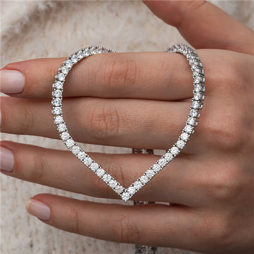 Silver V Model Waterway Women's Necklace You will love using this necklace, which reminds you of stars with its sparkling stones, for everyday life, special occasions, and nights out. The timeless V model waterway silver necklace awaits you, appealing to all women who want to create a stylish look. Silver white stone waterway women's necklace is a perfect option for a birthday gift, Valentine's Day gift, or as a gift for mothers on special occasions. Silver white stone waterway women's necklace is made of 925 sterling silver. Rhodium plated silver. Rhodium plated women's necklace preserves its shine for a long time and delays oxidation. Like all women's necklaces, silver white stone waterway women's necklace is handmade. Due to silver and precious stones, there may be a ± 10% deviation from the average product weight. Stone Width: 0.30 mm Necklace Length: 45 cm Average Weight: 26.00 gr.