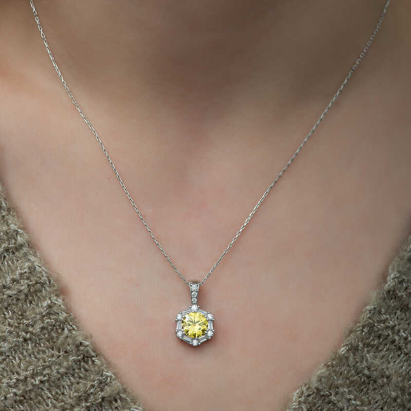 Silver Wheat Yellow Baguette Stone Women's Necklace Do you need a necklace that will increase your sparkle even more? Or maybe you've seen a necklace around you and you're looking for it everywhere? Sometimes you need a necklace, sometimes a ring, sometimes a bracelet. Whatever your budget, you're in the right place to find your dream pieces. Silver wheat yellow baguette stone women's necklace might be exactly the product you're looking for. This necklace is made of 925 sterling silver. Rhodium plated silver. Rhodium plated products preserve their shine for a long time and delay oxidation. Like other silver necklaces, silver walnut green baguette stone women's necklace is entirely handmade. Due to silver and precious stones, there may be a ± 10% deviation in product weight. Width: 1.00 cm Length: 3.00 cm Average Weight: 3.55 gr.