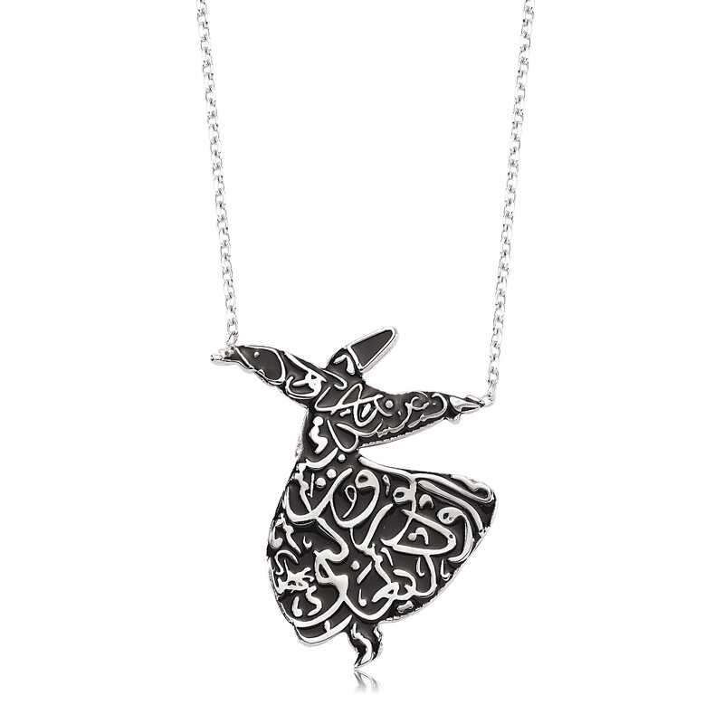 Silver Whirling Dervish Women's Necklace The Semah symbolically represents the formation of the universe, the resurrection of man in the universe, his taking action with love for the Almighty Creator and his realization of his servitude and turning towards the "Perfect Man". Every movement of the Semah has meaning. It provides peace when listened to with the sound of the ney. The right hand of the whirling dervishes looks to the sky and the left hand to the ground. This means that the right hand receives from God and gives it to the ring with the left hand turned to the ground. In this way, the rebirth is completed. You can enjoy this meaningful whirling dervish necklace and gift it to your loved ones. Oxide coating is made on silver. Oxide coating silver necklace models preserve their shine for a long time and gives the silver its black color. The average silver chain length is 45 cm. Like all silver necklace models, the silver whirling dervish women's necklace is produced by hand. Due to silver and precious stones, there may be a ± 10% deviation in the specified product weight. Width: 2.30 cm Length: 3.20 cm Average Weight: 4.30 gr.