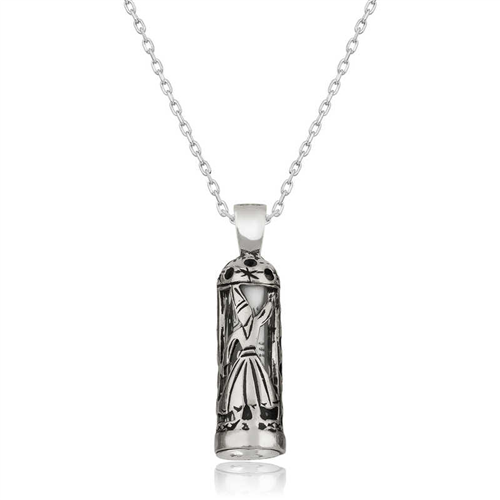 Silver Cevşen-ül Kebir Necklace with Whirling Dervish Pattern The souls who perform the whirling are called Semazen. "Sema" symbolically represents the formation of the universe, the resurrection of man in the universe, his taking action with love for the Almighty Creator, his realization of his servitude and his direction towards the "Perfect Man". You can choose the Cevşenül Kebir necklace, which is spiritual armor for humanity, as a birthday gift, Valentine's Day gift, or a gift for mothers on special occasions. The Cevşenül Kebir women's necklace model with a whirling dervish pattern is made of 925 sterling silver. Oxide coating is applied to the silver. Oxide-coated silver necklaces preserve their shine for a long time and delay tarnishing. Like all necklace models, this silver Cevşenül Kebir necklace model with a whirling dervish pattern is also produced entirely by hand. The average chain length is 45 cm. Due to silver and precious stones, there may be a ± 10% deviation in the average product weight. Width: 0.80 cm Length: 3.00 cm Average Weight: 6.00 gr