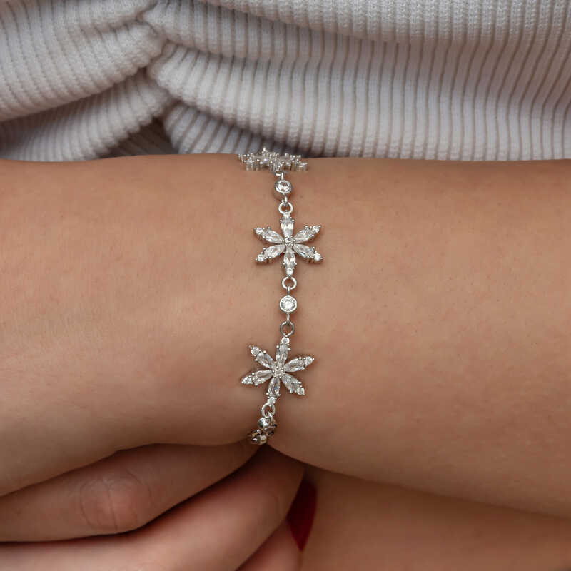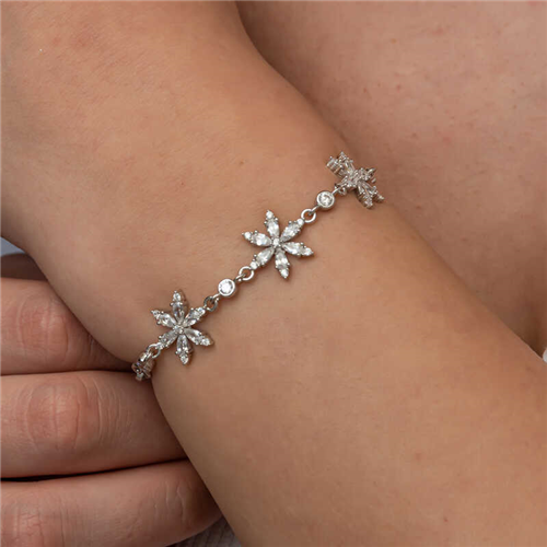 Silver White Lotus Flower Women's Bracelet The White Lotus Flower Women's Bracelet is an accessory with an elegant design that carries both aesthetics and depth of meaning. The lotus flower is considered a symbol of purity, renewal and spiritual growth in many cultures. This bracelet stands out with its elegance and grace and can be worn easily for daily use or special events. Rhodium plated silver. Rhodium plated white lotus flower women's bracelet models preserve their shine for a long time. Due to silver and precious stones, there may be ± 10% deviation from the average product weight. Lotus Flower Diameter: 1.00 cm Bracelet Length: 21 cm Avg. Weight: 5.50 gr.