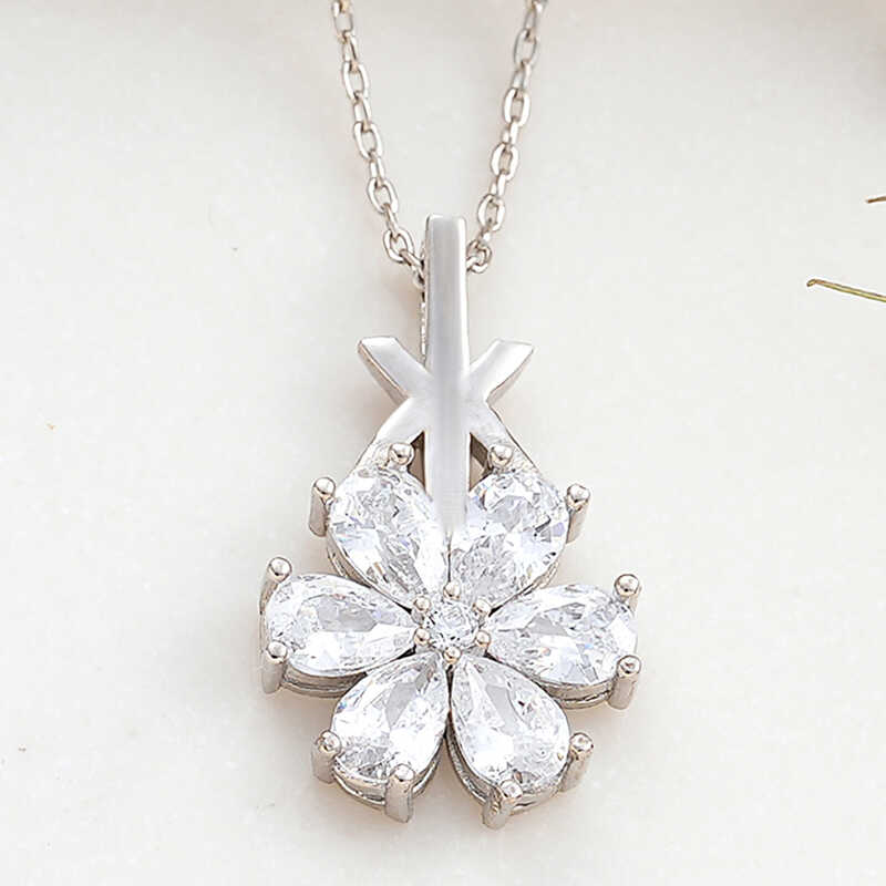 Silver White Love Flower Women's Necklace Why not express your feelings to your loved ones with an elegant flower patterned necklace? This stylish necklace, which is among the gift options that you can send to her on special occasions, is among the best ways to make your loved ones happy. Crafted with the highest quality, brightest, and most sparkling stones, the silver white love flower women's necklace is waiting for those who want to express their love once again, for those who want to say "you are a flower." This specially designed silver white love flower women's necklace is made of 925 sterling silver. Rhodium plated silver. Rhodium plated silver women's necklace models preserve their shine for a long time and oxidation is delayed. The average silver chain length is 50 cm. Like all women's silver necklace models, the silver white love flower women's necklace is also handmade. Due to silver and precious stones, there may be a ± 10% deviation in the specified product weight. Width: 1.50 cm Length: 2.30 cm Average Weight: 4.20 gr.
