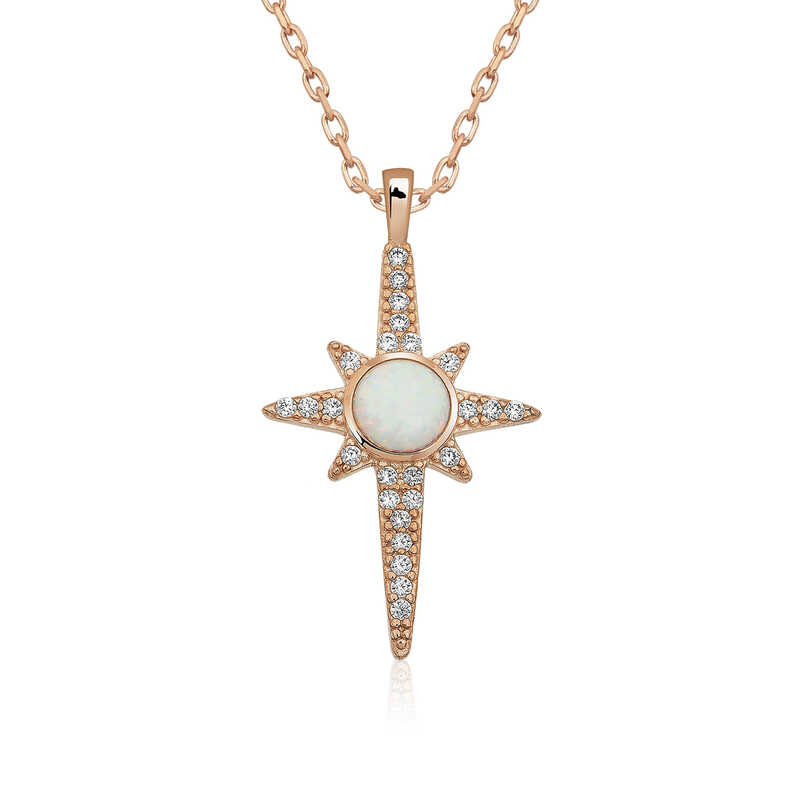 Silver North Star Necklace with White Opal Stone Since the Pole Star is almost in line with the Earth's axis, unlike other celestial bodies, it does not change place throughout the day and always points north. Because of this feature, it has been used for orientation and navigation throughout history. For the same reason, it is given names such as Demirkazık and Kuzey Yıldızı. The Pole Star is visible only from the northern hemisphere. Since it is the brightest star in this part of the sky, it is unlikely to be confused with another star. Crown your love with this meaningful North Star necklace. This stylish necklace model is made of 925 sterling silver. Rose plated silver. Rose plated silver necklaces preserve their shine for a long time, turn the silver color to pink and delay oxidation. The stones on it are white opal and zircon. The average chain length is 45 cm. All of our products are handmade. Due to silver and precious stones, there may be a ± 10% deviation in the average product weight. Width: 1.70 cm Length: 2.80 cm Average Weight: 2.65 gr.