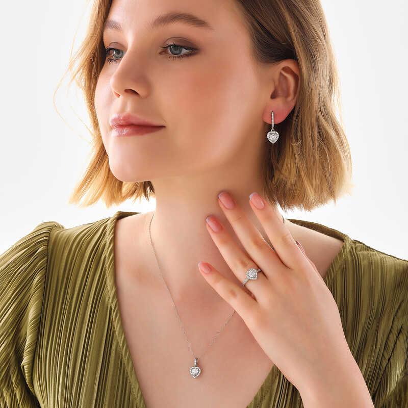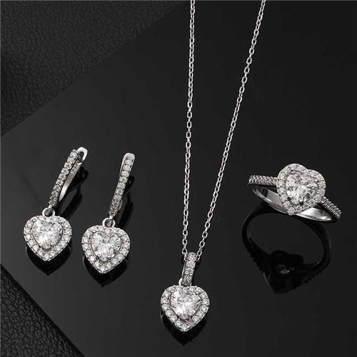 Silver White Stone Heart Women's Set Let your love come to life on the skin of the woman you love with the heart set model that expresses love with its heart pattern. Adorn your loved one with love with this heart women's set that can be chosen by young lovers and those who feel young on special occasions. The heart patterned set that your loved ones will enjoy wearing as much as you will be one of the best gifts for your loved one. The heart women's set is made of 925 sterling silver. Rhodium plated silver. Rhodium plated silver women's heart sets preserve their shine for a long time and oxidation is delayed. The white stones on the set are zirconias. Like all sets, the silver white stone heart women's set is produced by hand. Due to silver and precious stones, there may be ± 10% deviation from the average product weight. Ring Width: 2.10 cm Ring Length: 2.50 cm Average Weight: 3 gr Necklace Width: 0.90 cm Necklace Length: 1.00 cm Chain Length: 45 cm Average Weight: 3.10 gr Earring Width: 0.90 cm Earring Length: 2.60 cm Average Weight: 4 gr Total Weight: 10.10 gr