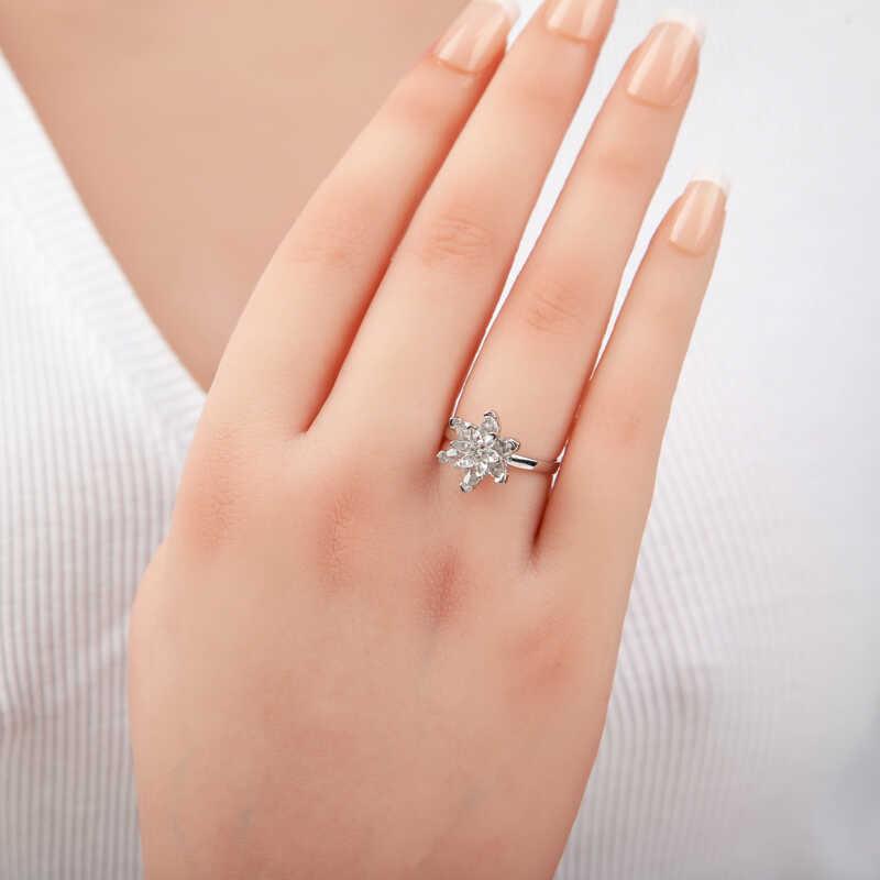 Silver Adjustable White Stone Lotus Flower Women's Ring The lotus flower is one of the most beautiful flowers that symbolize spirituality, morality, and cleansing. Blooming in the polluted waters of the rainforest, the lotus flower has managed to become a symbol of beliefs such as Buddhism and Hinduism with its beauty and purity. Moreover, the lotus flower is considered sacred in many ancient civilizations. Another detail that makes the lotus flower special is the region in which the flower grows. The lotus flower, which grows especially in swamps and muddy lands, can remain clean despite the polluted environment in which it grows. Able to clean even a single particle of dust that lands on it, the lotus flower greets those who encounter it with its pure white beauty. You can gift your loved ones or treat yourself with this silver white lotus flower ring, which is considered sacred in different cultures. This stylish ring is a perfect option for a birthday gift, Valentine's Day, or special occasions. The ring is made of 925 sterling silver. Rhodium plated silver. Like other rings, the silver white lotus flower ring is also handmade. Due to silver and precious stones, there may be a ± 10% deviation from the average product weight. Width: 1.80 cm Length: 2.30 cm Average Weight: 3.30 gr.