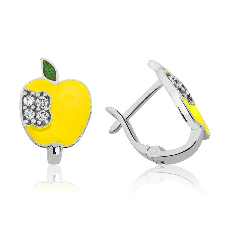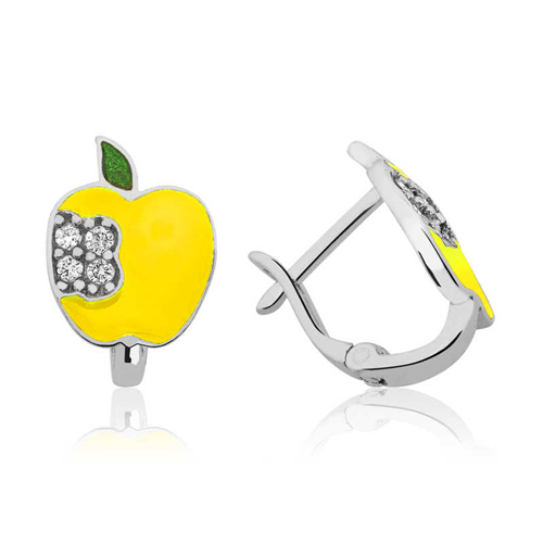 Silver Yellow Apple Children's Earrings You can choose a meaningful gift that can be treasured for a lifetime with elegant and colorful baby and children's earrings designed with cute figures for your most precious ones, your babies and children. Yellow apple figured children's earrings are made of 925 sterling silver. Rhodium plated silver. Rhodium plated silver children's earrings preserve their shine for a long time and oxidation is delayed. The stones on the earrings are zircon. All children's earring models are handmade. Due to silver and precious stones, there may be a ± 10% deviation in the average product weight. Width: 0.90 cm Length: 1.00 cm Average Weight: 1.35 gr.