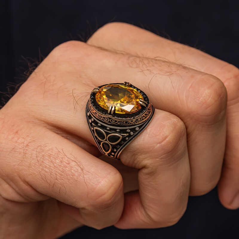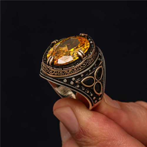 Silver Yellow Citrine Stone Men's Ring Silver Yellow Citrine Stone Men's Ring is made of 925 sterling silver. It is believed that Yellow Citrine attracts wealth, prosperity and success. Citrine nourishes creativity by increasing one's self-confidence. Designed for men, it stands out as a stylish and eye-catching accessory. You can gift it to yourself or your loved ones on your birthday, Father's Day or special occasions. Oxidized silver is coated. Oxidized silver men's ring models preserve their shine for a long time and oxidation is delayed. Due to silver and precious stones, there may be a ± 10% deviation in the average product weight. Ring Width: 1.60 cm. Ring Length: 2.50 cm. Average Weight: 20.00 gr.