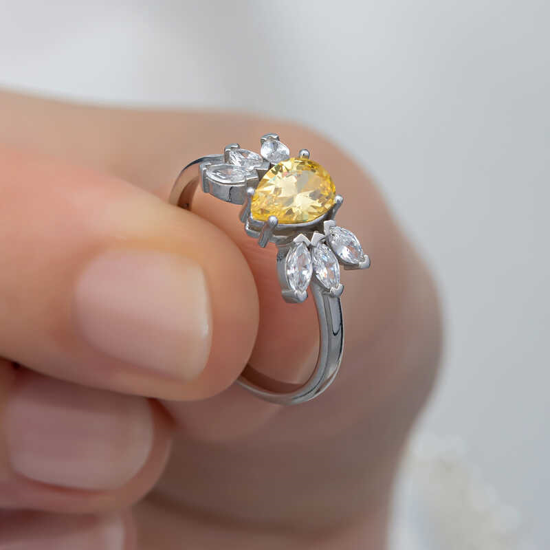 Silver Yellow Drop Zircon Stone Women's RingIt will be an ideal choice for those who want to get a stylish and simple look. The Drop Zircon stone women's ring is a model that you can buy for yourself and your loved ones with its simple and stylish design. This zircon stone women's ring is made of 925 sterling silver. Rhodium plated on silver. Rhodium plated models preserve their shine for a long time and oxidation is delayed. The stone on the multi-stone women's ring is zircon. Zircon stone women's ring is produced by handmade. Due to silver and precious stones, there may be ± 10% deviation in the weight of the product.Width: 1.90 cmLength: 2.20 cmAvg. Weight: 2.20 gr.