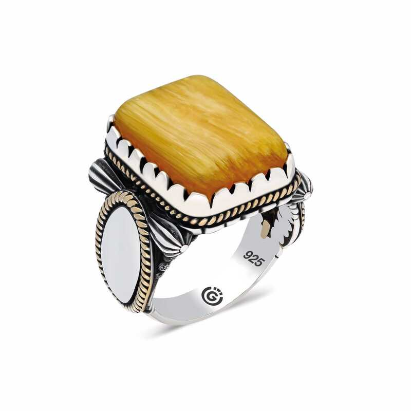 Silver Square Men's Ring with Yellow Pressed Amber StoneThis men's ring model, made of Yellow Pressed Amber stone on silver, is a stylish accessory that you can use at any time of the day. You can gift this ring to yourself or your loved ones on your birthday, Father's Day or special occasions. The yellow amber stone men's ring model is made of 925 sterling silver. Oxidized silver is coated. Oxidized silver men's rings preserve their shine for a long time. As with all men's rings, the silver Square Men's Ring with Yellow Pressed Amber Stone is also produced by hand. Due to silver and precious stones, there may be a ± 10% deviation from the average product weight.Average Weight: 17.00 gr.