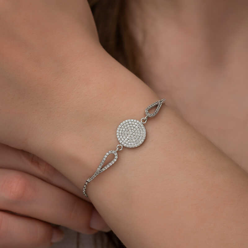 Silver Zircon Stone Circle Bracelet You can use our silver bracelet models, designed in harmony with fashion, in an elegant way both in your daily life and on special days and nights. You can complete your outfits with innovative products that appeal to the taste of women of all ages. With designs that each appeal to a different style, you can choose our models that suit your sporty, classic and alternative clothing styles. This stylish bracelet is a perfect option for a birthday gift, a Valentine's Day gift or on special occasions. Silver zircon stone women's bracelet is made of 925 sterling silver. This bracelet is rhodium plated. Rhodium plated products preserve their shine for a long time and delay oxidation. Like all silver women's bracelet models, the silver zircon stone circle women's bracelet model is also handmade. Due to silver and precious stones, there may be a ± 10% deviation in the average product weight. Width: 1.40 cm Length: 6.00 cm Average Weight: 5.00 gr. Average Length: 20.00 cm