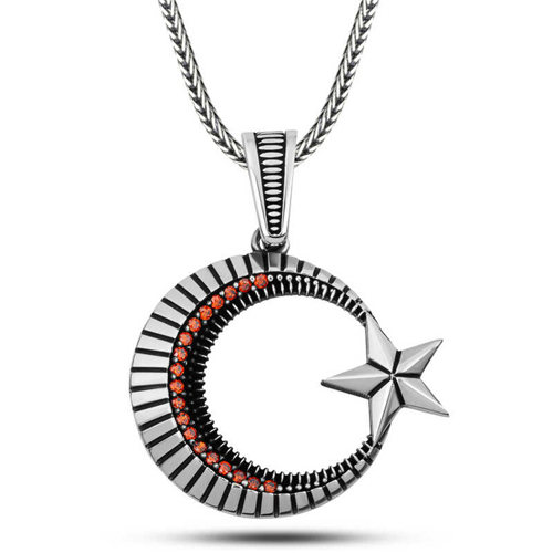 Silver Zircon Crescent Star Men's Necklace The moon and star have an especially important place in Turkish culture. These symbols represent Turkish identity and the spirit of independence. These motifs on the necklace can give the person a sense of national belonging. The moon generally means direction and guidance, while the star is seen as a source of strength and inspiration. These two symbols indicate that a person will find strong guidance and support in their life. This stylish necklace is an excellent choice for a birthday gift, Valentine's Day or Father's Day. The silver is oxidized. Like all silver necklaces, the silver crescent star necklace model is handcrafted. Due to silver and precious stones, there may be ± 10% deviation from the average product weight. Width: 3.00 cm Length: 3.50 cm Chain Length: 55 cm Average Weight: 12.00 gr.