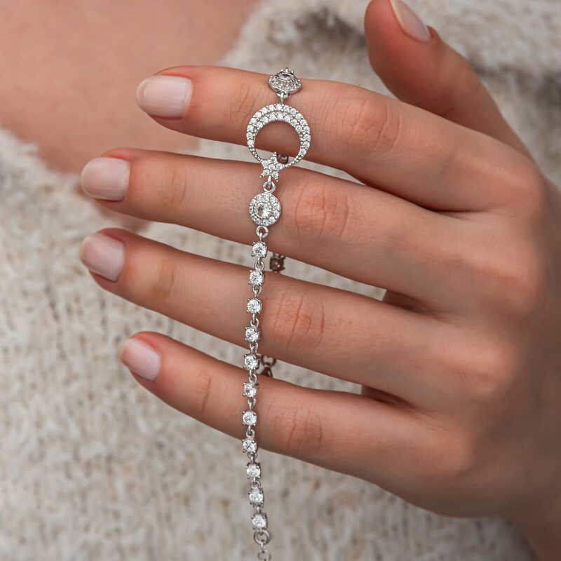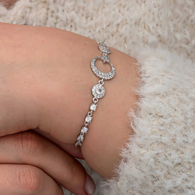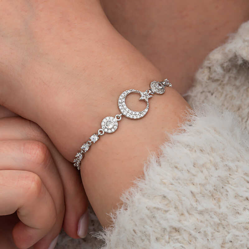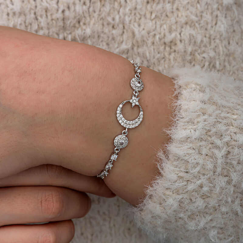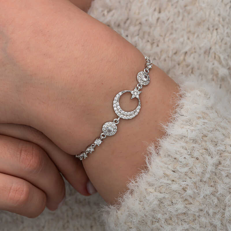 Silver Zircon Stone Crescent Star Women's Bracelet We know that the Turkish flag was inspired by the crescent and star reflected in the bloodbath. We offer you an unmissable opportunity to carry the sacred meaning of the flag on your wrists and share it with your loved ones. The crescent star is an important symbol in Turkish culture and generally represents freedom, independence and national identity. The use of the crescent star symbol in women's bracelets symbolizes these values while also standing out as an element of elegance. The crescent star women's bracelet is made of 925 sterling silver. Rhodium plated silver. All rhodium plated silver women's bracelet models preserve their shine for a long time. Like all our silver women's bracelet models, the silver crescent star women's bracelet is also handmade. Due to silver and precious stones, there may be ± 10% deviation in the average product weight. Width: 1.50 cm Length: 1.20 cm Bracelet Length: 21 cm Average Weight: 5.00 gr.