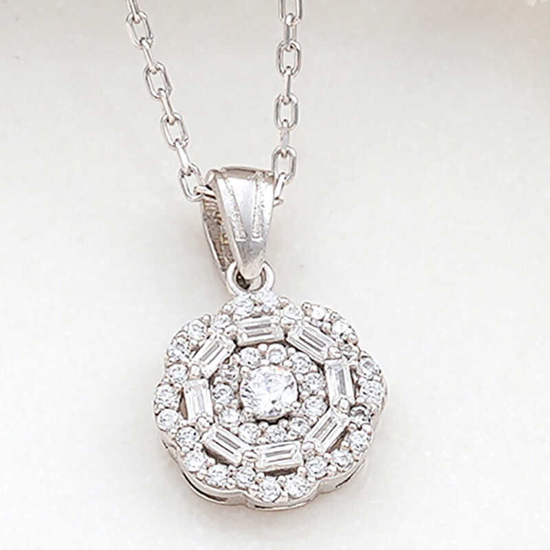 Silver Zircon Stone Flower Women's NecklaceThis specially designed flower women's necklace made of zircon and tiny baguette stones is made of 925 sterling silver. You can make your first love, your mother, your wife or your lover, feel how much you love them on special occasions and make them happy. Show the value they add to your life with this necklace that your loved ones will love to use. The silver zircon stone flower women's necklace model is rhodium plated. All silver necklace models with rhodium plating preserve their shine for a long time and oxidation is delayed. The chain that comes with the silver zircon stone flower women's necklace is silver and is 45 cm in length. Like all silver women's necklace models, the silver zircon stone flower women's necklace is also handmade. Due to silver and precious stones, there may be a ± 10% deviation in the average product weight.Necklace Width: 1.00 cmNecklace Length: 1.10 cmChain Length: 45 cmNecklace Weight: 2.50 gr.