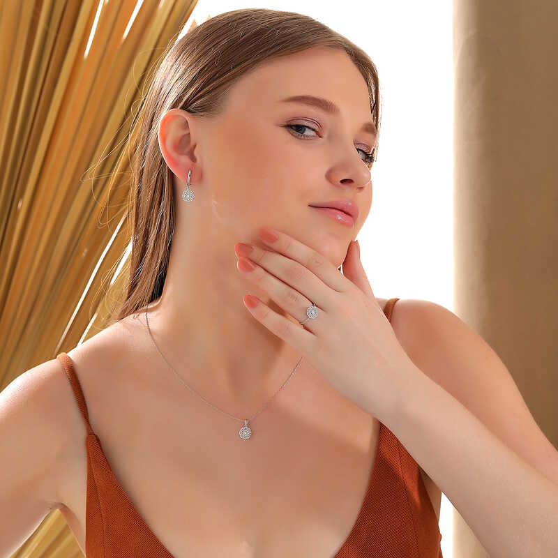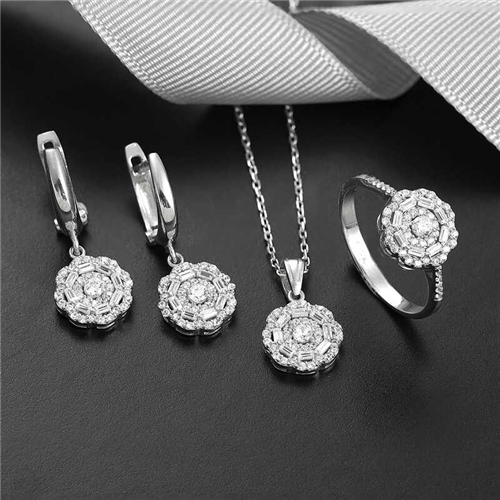 Silver Zircon Stone Flower Women's SetThis specially designed flower women's set composed of zircon and tiny baguette stones is made of 925 sterling silver. You can make your first love, your mother, your wife or your girlfriend, feel how much you love her on special occasions and make them happy. Show the value they add to your life with this set that your loved ones will love to use. The silver zircon stone flower women's set model is rhodium plated. All silver set models with rhodium plating preserve their shine for a long time and oxidation is delayed. The chain that comes with the silver zircon stone flower women's set is silver and is 45 cm in length. Like all silver women's set models, the silver zircon stone flower women's set is also handmade. Due to silver and precious stones, there may be ± 10% deviation from the average product weight.Necklace Width: 1.00 cmNecklace Length: 1.10 cmChain Length: 45 cmNecklace Weight: 2.50 gr.Earring Width: 1.00 cmEarring Length: 2.60 cmEarring Weight: 3.50 gr.Ring Width: 2.00 cmRing Length: 2.50 cmRing Weight: 2.00 gr.Total Weight: 8.00 gr