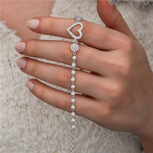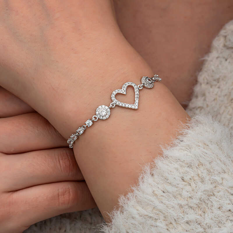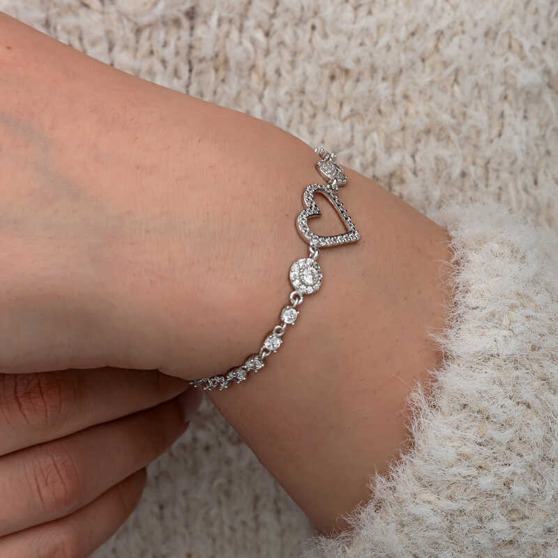 Silver Zircon Stone Heart Women's Bracelet Let your love come to life on the skin of the woman you love with the silver heart women's bracelet that expresses love with its heart pattern. How about making your loved ones happy with this stylish heart pattern? You can make them happy by gifting this bracelet full of love to your beloved on her birthday, Valentine's Day or special days. This heart bracelet is made of 925 sterling silver. Rhodium plated on silver. Rhodium plated silver women's bracelet models preserve their shine for a long time and delay oxidation. Like all silver women's bracelet models, the silver heart women's bracelet is also produced by handmade. Due to silver and precious stones, there may be ± 10% deviation in the specified product weight. Width: 1.50 cm Length: 1.20 cm Bracelet Length: 21 cm Average Weight: 5.00 gr.