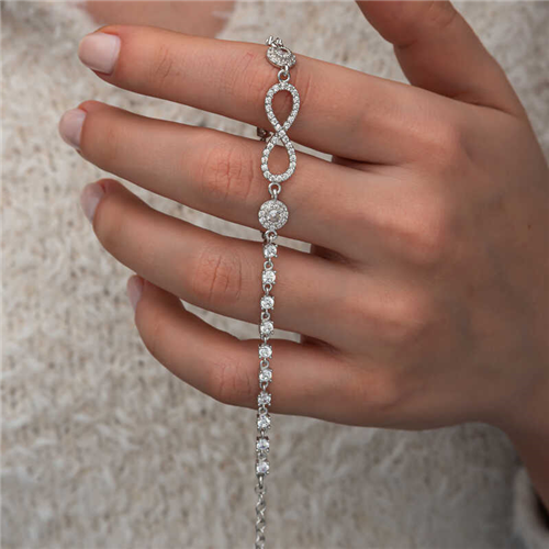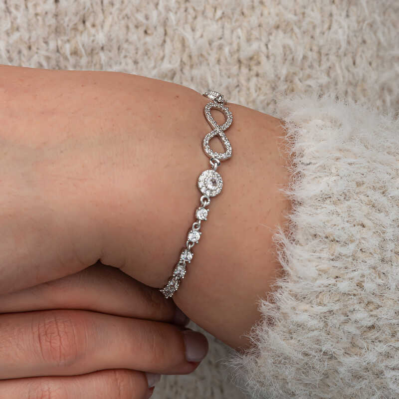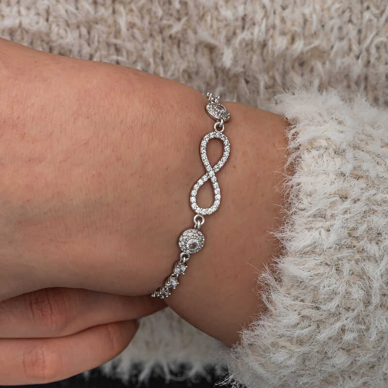 Silver Zircon Stone Infinity Women's Bracelet The infinity symbol represents something that has no end, unending love, friendship or commitment. In romantic relationships, it symbolizes the ongoing and eternal love between two people. It represents family or friendship ties at a high level; it expresses your permanent commitment with your loved ones. The zircon stone infinity women's bracelet model is made of 925 sterling silver. Rhodium-plated women's bracelets preserve their shine for a long time and delay oxidation. Like all silver women's bracelet models, this silver infinity women's bracelet is also produced entirely by hand. Due to silver and precious stones, there may be a ± 10% deviation in the average product weight. Width: 2.00 cm Length: 1.00 cm Bracelet Length: 21 cm Average Weight: 5.00 gr.