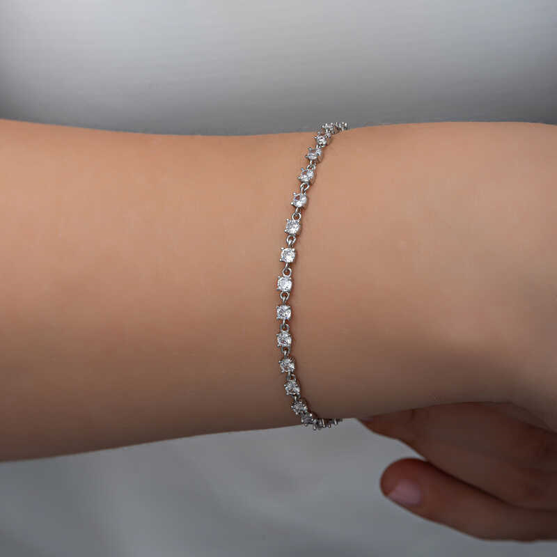 Silver Zircon Stone Women's BraceletSilver bracelets, which are among the favorite accessories of special occasions and also daily wear, meet you with their original designs. By examining the bracelet models that offer you the most elegant ways to emphasize your style and reflect it outside, you can have bracelet models that you can use at any moment of the day. Silver zircon stone women's bracelet is also among these bracelets. The zircon stone bracelet that you can use on daily and special occasions is made of 925 sterling silver. Rhodium plated silver. Rhodium plated silver products preserve their shine for a long time. Like all silver bracelets, the silver zircon stone women's bracelet model is produced by hand. Due to silver and precious stones, there may be ± 10% deviation in the specified product weight.Width: 0.30 cmLength: 0.30 cmChain length: 21 cmAverage Weight: 4.70 gr.