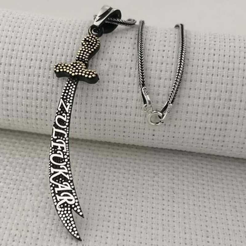 Silver Zulfiqar Sword Men's Necklace Hz. Ali showed great heroism in the Battle of Uhud. His sword broke while trying to protect the Prophet Muhammad (pbuh) in the battle. Seeing this, the Prophet gave him his own sword, Zulfiqar. With the sharpness of the sword, he split other swords in half and wrote epics in battles. Hz. Ali is now in battles with the Zulfiqar sword... It is known that the sword was taken to heaven after Hz. Ali's death. According to another narration, it is known to be between the Tigris and Euphrates rivers. The person who will rule the armies of Islam will own that sword and be the commander-in-chief of the armies. You can choose this stylish necklace as a birthday gift, Valentine's Day gift or a gift on special occasions. The necklace is made of 925 sterling silver. Oxide coating on silver. Oxide coating preserves its shine for a long time and gives the silver its black color. As with all necklaces, this silver Zulfiqar sword necklace is also entirely handmade. The stones on it are zircon. Due to silver and precious stones, there may be a ± 10% deviation from the average product weight. Width: 1.10 cm Length: 5.80 cm Average Chain Length: 55 cm Average Weight: 11.20 gr.