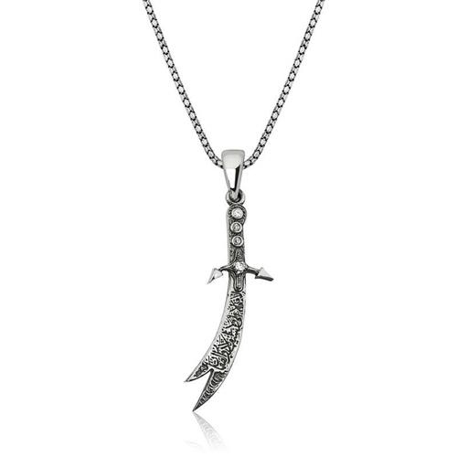 Silver Zulfiqar Sword Men's Necklace Hz. Ali showed great heroism in the Battle of Uhud. His sword broke while trying to protect the Prophet Muhammad (pbuh) in the battle. Seeing this, the Prophet gave him his own sword, Zulfiqar. With the sharpness of the sword, he split other swords in half and wrote epics in battles. Hz. Ali is now in battles with the Zulfiqar sword... It is known that the sword was taken to heaven after Hz. Ali's death. According to another narration, it is known to be between the Tigris and Euphrates rivers. The person who will rule the armies of Islam will own that sword and be the commander-in-chief of the armies. You can choose this stylish necklace as a birthday gift, Valentine's Day gift or a gift on special occasions. The necklace is made of 925 sterling silver. Oxide coating on silver. Oxide coating preserves its shine for a long time and gives the silver its black color. As with all necklaces, this silver Zulfiqar sword necklace is also entirely handmade. The stones on it are zircon. Due to silver and precious stones, there may be a ± 10% deviation from the average product weight. Width: 1.30 cm Length: 5.00 cm Avg. Weight: 10.00 gr. Avg. Chain Length: 55 cm