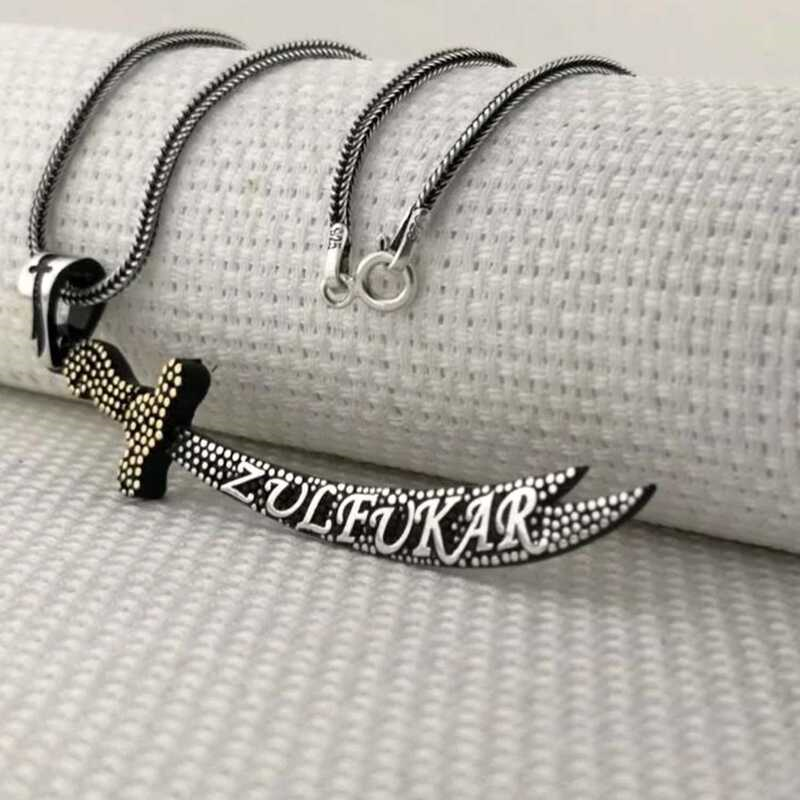 Silver Zulfiqar Sword Men's Necklace Hz. Ali showed great heroism in the Battle of Uhud. His sword broke while trying to protect the Prophet Muhammad (pbuh) in the battle. Seeing this, the Prophet gave him his own sword, Zulfiqar. With the sharpness of the sword, he split other swords in half and wrote epics in battles. Hz. Ali is now in battles with the Zulfiqar sword... It is known that the sword was taken to heaven after Hz. Ali's death. According to another narration, it is known to be between the Tigris and Euphrates rivers. The person who will rule the armies of Islam will own that sword and be the commander-in-chief of the armies. You can choose this stylish necklace as a birthday gift, Valentine's Day gift or a gift on special occasions. The necklace is made of 925 sterling silver. Oxide coating on silver. Oxide coating preserves its shine for a long time and gives the silver its black color. As with all necklaces, this silver Zulfiqar sword necklace is also entirely handmade. The stones on it are zircon. Due to silver and precious stones, there may be a ± 10% deviation from the average product weight. Width: 1.10 cm Length: 5.80 cm Average Chain Length: 55 cm Average Weight: 11.20 gr.