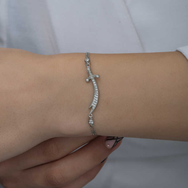 Silver Zulfiqar Sword Women's Bracelet Hz. Ali showed great heroism in the Battle of Uhud. His sword broke while trying to protect the Prophet in the battle. Seeing this, the Prophet gave his own sword, Zulfiqar, to him. With the sharpness of the sword, he split other swords in half and had epics written in battles. Hz. Ali is now in battle with his Zulfiqar sword. It is believed that the sword was taken to heaven after the death of Ali. Another narration states that it lies between the Tigris and Euphrates Rivers. The person who will rule the Islamic armies will own that sword and become their commander-in-chief. This design, crafted with this spirituality, is very striking. This stylish bracelet is a perfect choice for birthday gifts, Valentine's Day gifts, or special occasions as a gift for mothers. The Zulfiqar sword women's bracelet model is made of 925 sterling silver. The stones in this special design are zircon. This women's silver bracelet is rhodium-plated. Rhodium-plated bracelets retain their shine for a long time and delay oxidation. As with all silver bracelets, this silver Zulfiqar sword women's bracelet model is also handcrafted. Due to the silver and precious stones, there may be a ±10% deviation from the stated average product weight. Zulfiqar Sword Width: 1.00 cm Zulfiqar Sword Length: 4.00 cm Bracelet Length: 20.00 cm Average Weight: 3.00 gr.