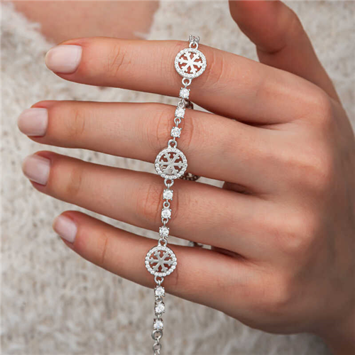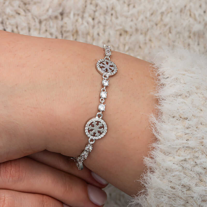 Snowflake Women's Bracelet in a Silver Hoop Each snowflake is different, which symbolizes individuality and originality. The ring symbolizes simplicity and eternity. It points to the cyclicity of life and the permanence of relationships. It also symbolizes that people can live happily without hurting each other, just like snowflakes. This stylish bracelet is a perfect option for a birthday gift, a Valentine's Day gift or a gift for mothers on special occasions. The bracelet is made of 925 sterling silver. Rhodium plated silver. Rhodium plated products preserve their shine for a long time and oxidation is delayed. Like all silver bracelets, this silver rhodium snowflake women's bracelet is entirely handmade. Due to silver and precious stones, there may be a ± 10% deviation in the average product weight. Width: 1 cm Bracelet Length: 21 cm Average Weight: 6.00 gr.