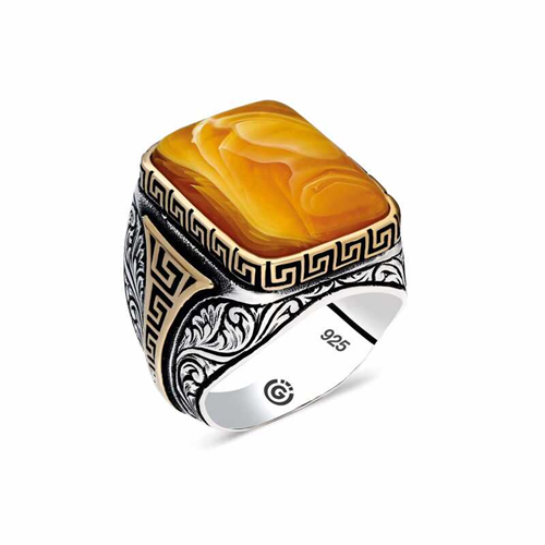 Silver Patterned Tightened Orange Amber Stone Square Men's RingThis men's ring model, made of Patterned Orange Tightened Amber stone on silver, is a stylish accessory that you can use at any time of the day. You can gift this ring to yourself or your loved ones on your birthday, Father's Day or special occasions. Patterned Orange Amber stone men's ring model is made of 925 sterling silver. Oxidized silver is coated. Oxidized silver men's rings preserve their shine for a long time. As with all men's rings, the silver Orange Tightened Amber stone Square men's ring model is also handmade. Due to silver and precious stones, there may be ± 10% deviation from the average product weight.Average Weight: 17.00 gr.