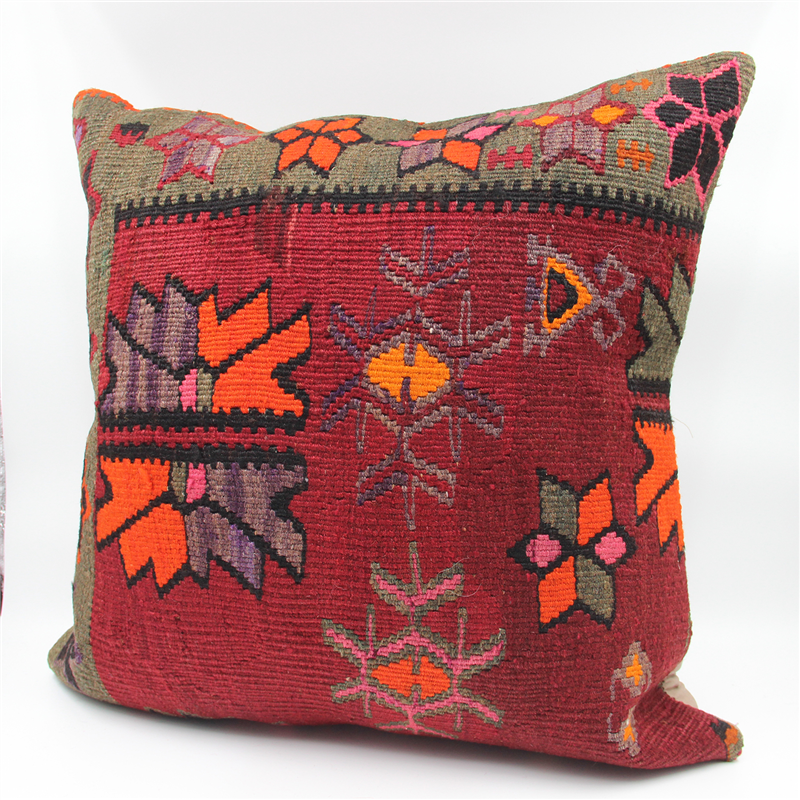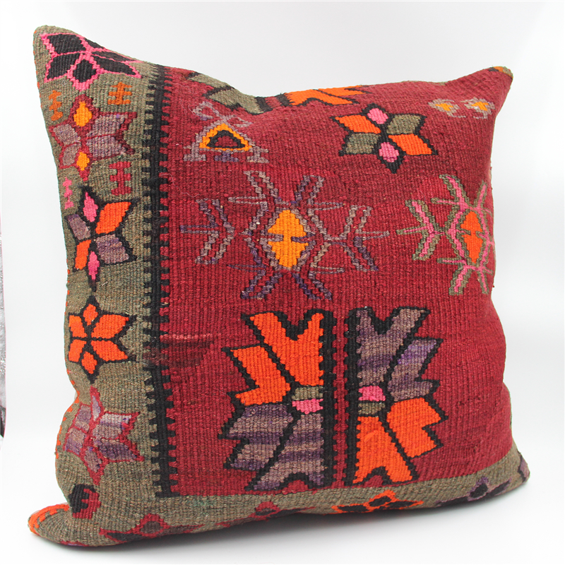 Kilims used in our products are old and genuine. These Kilim Cushions are made with pieces of carpets and kilims joined to make Kilim Cushion Covers. Kilim Pillows can be made for order for any size. Back has cotton with a zipper.