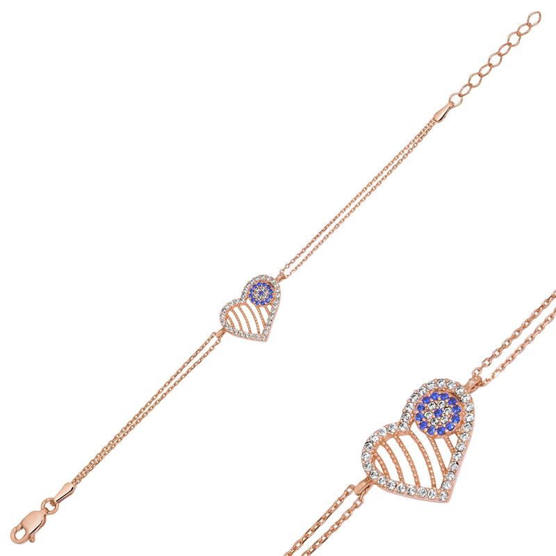 Silver Rose Evil-Eye Heart Women's BraceletThe heart is an essential part of the human body and symbolizes love and affection. The heart is an indispensable symbol of silver jewelry. This specially designed silver bracelet with a heart motif will enhance your beauty, and the evil-eye bead will keep you away from evil eyes. Made of 925 sterling silver, the white stones on this stylish women's bracelet are zircon. Delight yourself or your loved ones with this stylish and sparkling infinity set. The silver evil-eye heart women's bracelet is rose gold-plated. All silver women's bracelets with rose gold plating maintain their shine for a long time. The extension chain on the bracelet is suitable for wrists up to 21 cm. Like all our silver women's sets, the silver infinity women's set is handmade. Due to the silver and precious stones, there may be a ±10% deviation in the specified product weight.Average Weight: 3.00 gr.