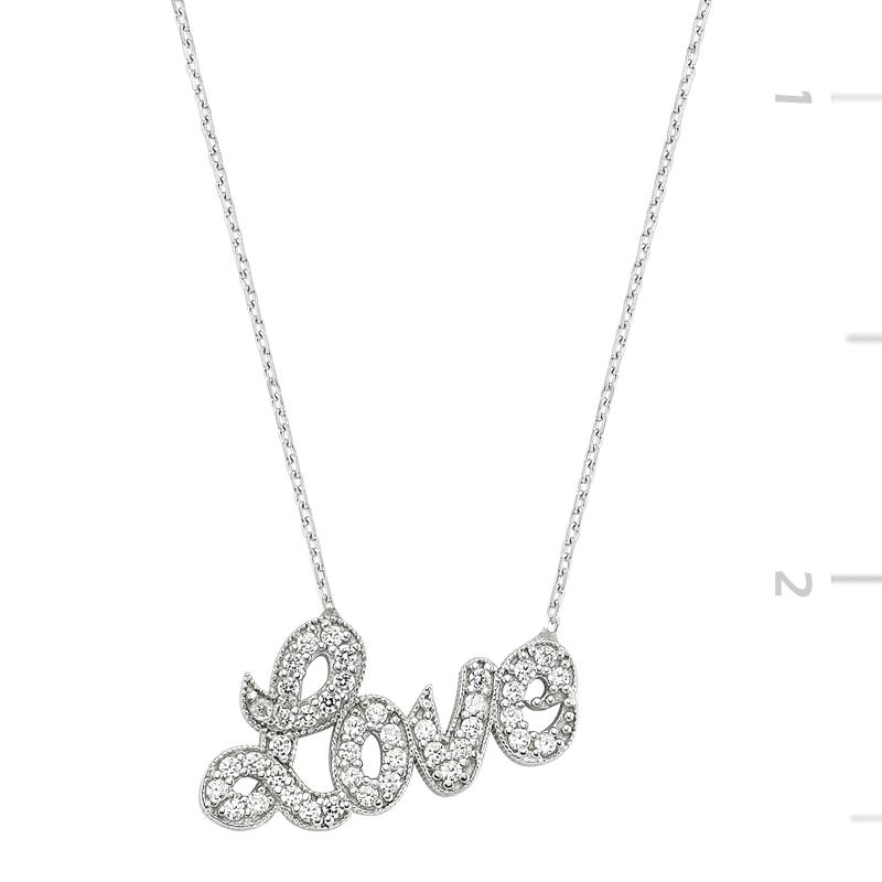 Silver Love Written Women's Necklace Love written necklaces are the most sublime design that embraces love and affection with all its purity ... How about expressing your love in every language? You can make your beloved happy by gifting this necklace full of love to her on her birthday, Valentine's Day or special occasions ... This love necklace is made of 925 sterling silver. Rhodium plated silver. Rhodium plated silver necklace models preserve their shine for a long time and delay oxidation. The stones on it are zircon. Like all silver women's necklace models, the silver love written women's necklace model is also handmade. There may be a ± 10% deviation in the specified product weight due to silver and precious stones.