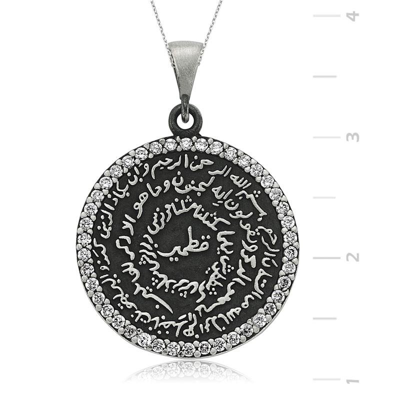 Silver Round Stone Kıtmir Women's NecklaceIt has the 51st and 52nd verses of Surah Al-Qalam, the names of the Companions of the Cave and the word kıtmir in the middle. Also known as the evil eye prayer, kıtmir is also used as a gift for newborn babies as a ward off the evil eye. Kıtmir prayer necklace is made of 925 sterling silver. The stones around it are round zirconias. It is sent with an approximately 45 cm silver chain. Oxidized silver is applied to preserve its shine for a long time. All of our women's silver necklace models are handmade. Due to silver and precious stones, there may be a ± 10% deviation in the average product weight.
